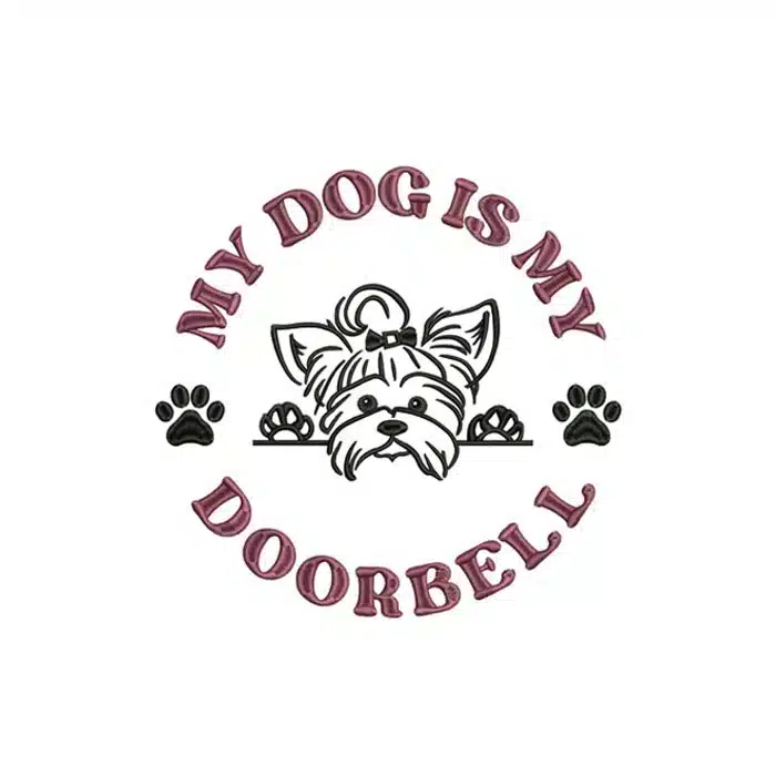 If you have a four-legged security system that alerts you to every visitor, leaf, and squirrel, this design is for you! This charming and humorous machine embroidery pattern is a perfect tribute to our vigilant canine companions. It features an adorable peeking Yorkshire Terrier, complete with a cute bow, framed by the all-too-true phrase, “My Dog Is My Doorbell.”