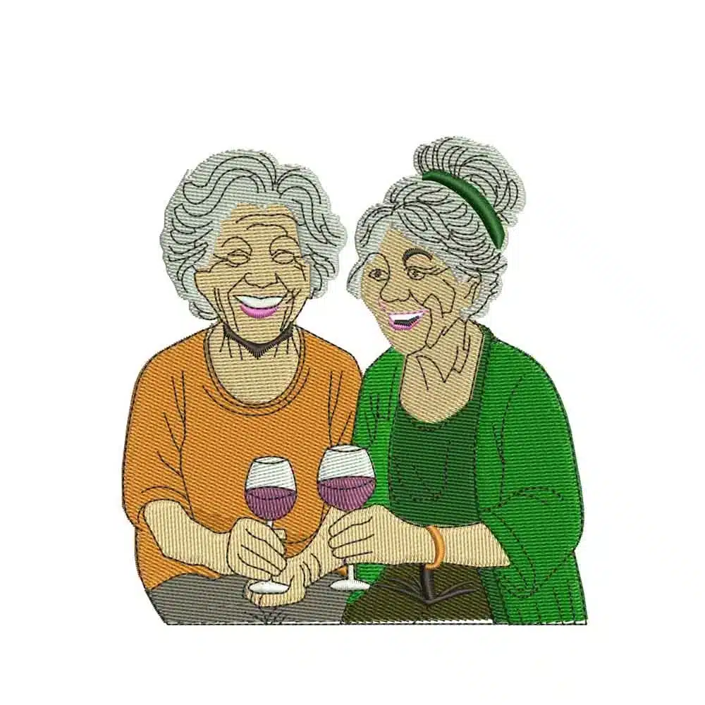 Capture the essence of cherished moments and lifelong bonds with this heartwarming and humorous machine embroidery design. This beautiful pattern features two elderly best friends sharing a joyful laugh while clinking their glasses of wine, perfectly illustrating that some things—like good friends and good wine—only get better with age. The detailed stitching brings their happy expressions and warm companionship to life.