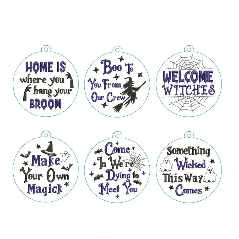 Embrace the spirit of the season with this enchanting Halloween Ornament Bundle of digital machine embroidery designs! This collection features six unique, circular designs, each adorned with playful and spooky phrases that capture the essence of Halloween. From whimsical witches to charmingly eerie sayings like “Home is where you hang your broom” and “Something Wicked This Way Comes,” these designs are perfect for adding a hauntingly good touch to your projects.