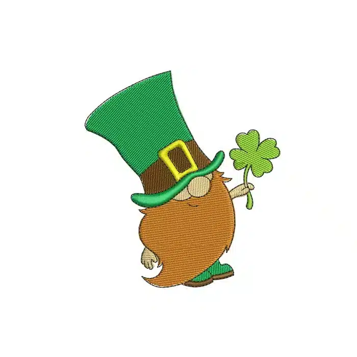 Get ready to sham-rock your embroidery projects with this irresistibly charming leprechaun gnome! This festive design is filled with personality, from the gnome’s oversized green top hat with its golden buckle to his magnificent orange beard. Holding a lucky four-leaf clover, this little guy is ready to bring a touch of magic and Irish cheer to your St. Patrick’s Day celebrations.
