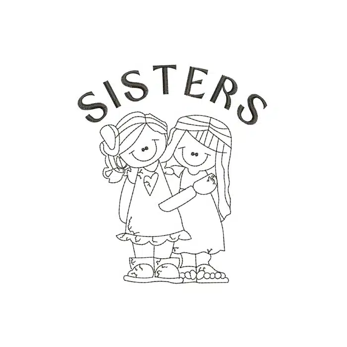 Capture the timeless and unbreakable bond between sisters with this simple yet profoundly sweet machine embroidery design. This pattern features a heartwarming illustration of two smiling girls in a loving embrace, perfectly expressing the joy of sisterhood. The classic “SISTERS” text arched above them completes this charming scene.