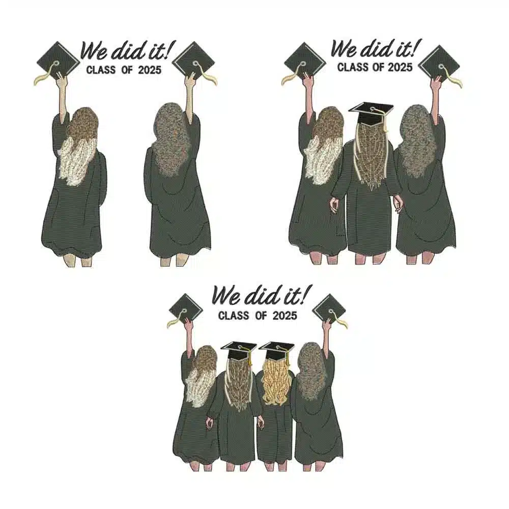 Celebrate the monumental achievement of graduation with our uplifting “We Did Girls Class Of 2025” machine embroidery design! This collection features three empowering variations – for 2, 3, or 4 graduating girls – with their backs to you, cheering with their caps held high, proudly declaring “We did it! CLASS OF 2025.” Perfect for creating personalized gifts, cherished commemorative apparel, or special keepsakes for the graduates in your life, this design beautifully captures the joy and triumph of this significant milestone.