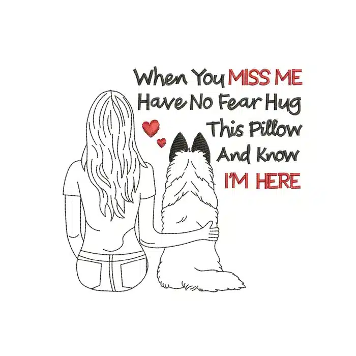 Create a tangible source of comfort for anyone grieving the loss of a furry friend with this heartfelt machine embroidery design. Featuring a simple yet powerful line-art illustration of a person embracing their loyal dog, this pattern is paired with the tender quote, “When You Miss Me Have No Fear Hug This Pillow And Know I’m Here.” The selective use of color on the most poignant words adds a touch of warmth to the minimalist design.
